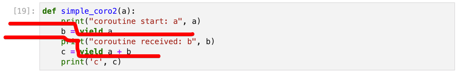 아래과 같은 함수 있으면 다음과 같이 나눠진다. 첫 번째 빨간색 라인이 next(generator instance)를 실행했을 때고 generator_instance.send(x)를 실행했을 때는 그 다음 빨간색 라인 부분까지 실행이된다.