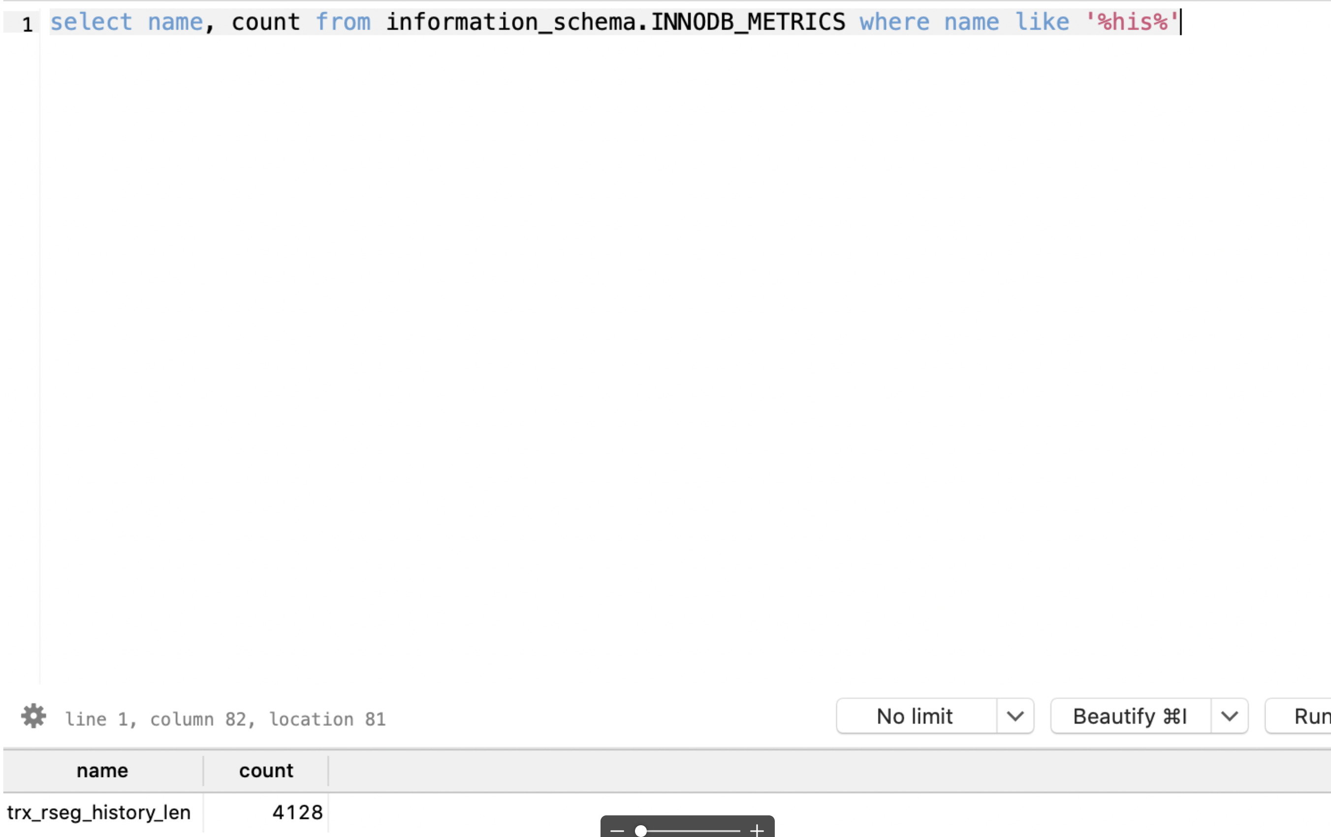 select name, count from information_schema.INNODB_METRICS where name like '%hist%';
